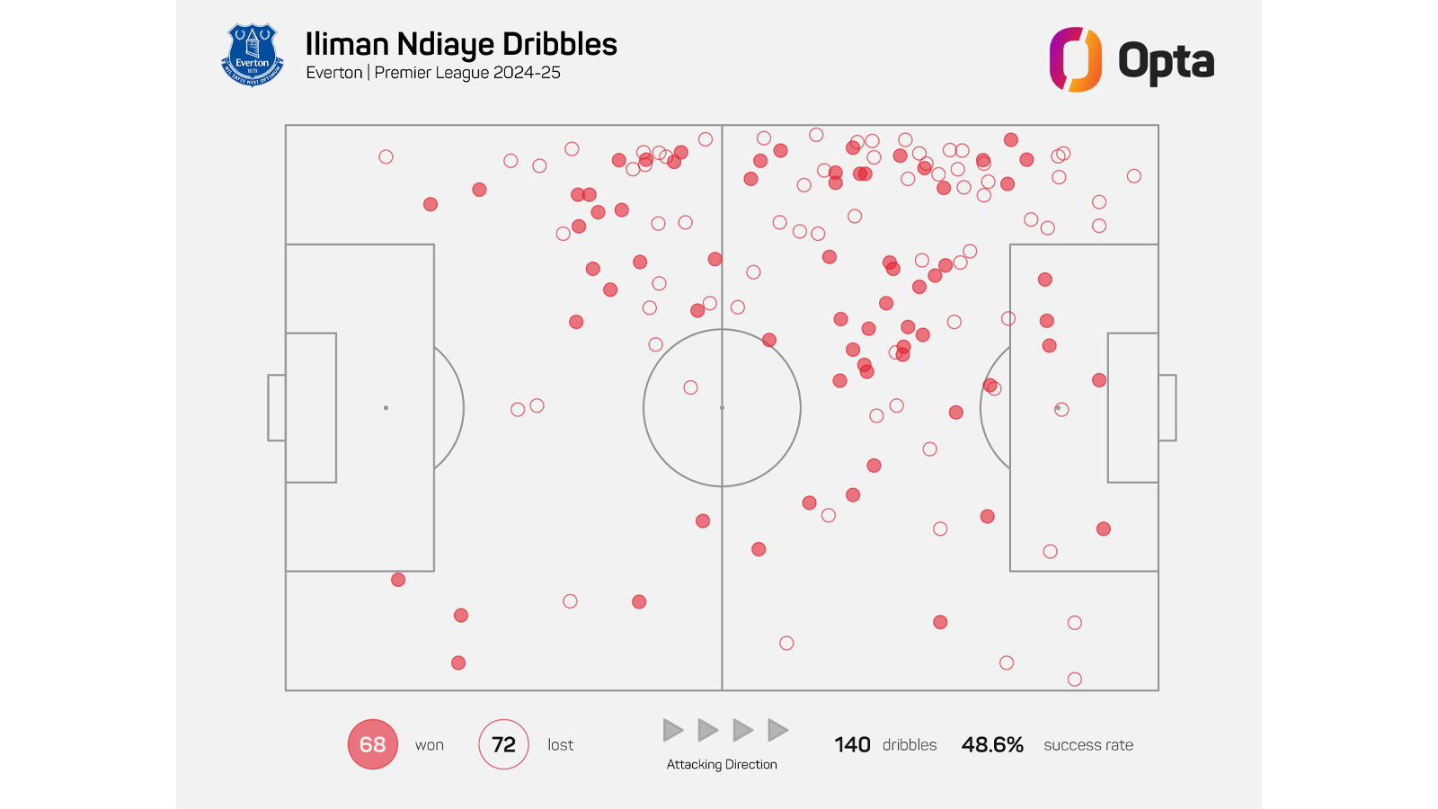 As you can see from this graphic below displaying Ndiaye’s dribbles, he does enjoy running at defenders down the left.